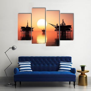 Silhouetted oil rigs stand against a late-evening ocean sunset in warm orange and yellow tones, with black and white accents. The realistic, modern landscape follows a rule-of-thirds composition and features a large sun reflection on the water, creating a calm, industrial atmosphere. Suited to modern or industrial home spaces and contemporary room decor.