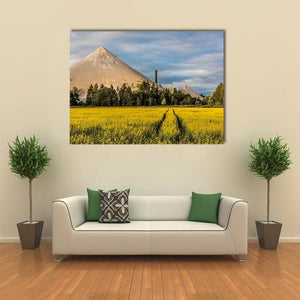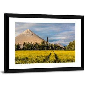 An oil-painting landscape of an oil shale ash heap beside a wide field of yellow flowers, with trees, a distant chimney, visible tire tracks and a cloudy daytime sky. Rendered realistically, the image emphasizes an industrial-versus-natural contrast and fits modern or industrial-style rooms.