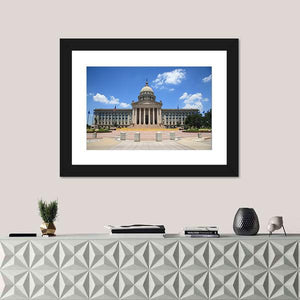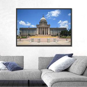 This captivating canvas depicts the grand Oklahoma Capitol Building, featuring its iconic dome, imposing columns, and well-kept courtyard. The sunny palette of blue, white, and gray complements the photorealistic style, making it a striking addition to any wall.