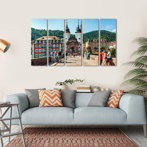 This captivating canvas features the iconic cobblestone bridge and town gate of Heidelberg, Germany. With a vibrant palette of blue, brown, and green, it captures a sunny, lively atmosphere filled with people. Perfect for adding a touch of warmth and travel inspiration to your decor.