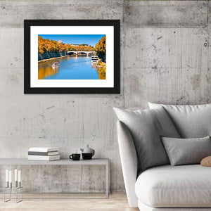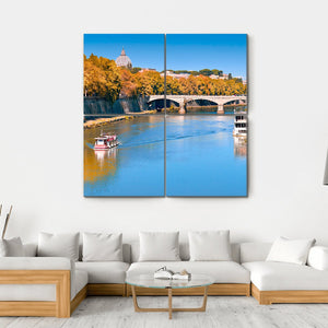 This beautiful canvas art captures the serene essence of the Tiber River, showcasing a historic bridge amidst vibrant autumn foliage. A boat glides peacefully on the water, framed by charming buildings and a distant dome, making it a stunning addition to any wall.