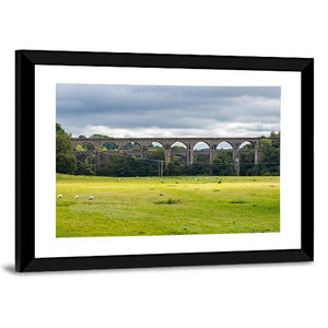 This panoramic canvas shows a stone, arched viaduct crossing a green field beneath a calm, overcast sky. Fluffy clouds and sheep grazing in the pasture give the scene a quiet, rustic mood that suits country-inspired living rooms and rustic spaces.