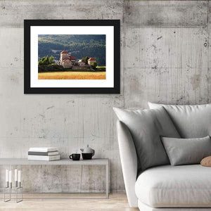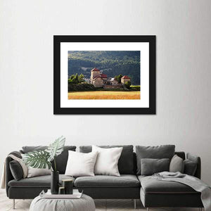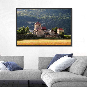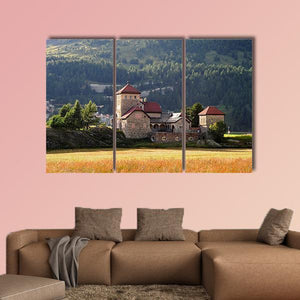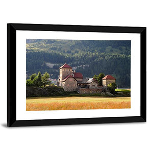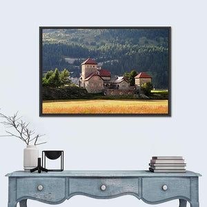 Old Building In Silvaplana shows a stone castle with red roofs set in a grassy field, framed by tall trees and distant mountains. The realistic, rustic landscape uses gold, green, brown and red tones with a rule-of-thirds composition to create a serene, idyllic mood that suits rustic or nature-themed rooms.