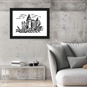 This striking canvas artwork features a dramatic landscape of a historic castle, nestled among textured foliage and wispy clouds. With its gothic style and centered composition, it adds a captivating touch to any room.