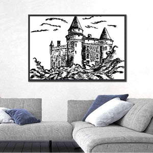 This artwork brings to life the imposing beauty of a castle, set against dramatic, sketched clouds and dark foliage. The monochromatic palette evokes a historic atmosphere, making it a striking addition to any wall space.