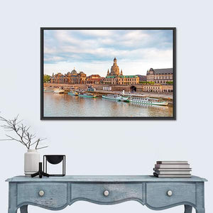 Old Dresden Over River Canvas depicts a calm, historic cityscape with a river, buildings, a domed landmark and two passenger boats docked along the bank. Rendered in realistic detail with a blue, gold, green and grey palette, it brings a quiet riverside atmosphere to a room. It works well in living rooms, entryways and home offices with classic or modern decor.