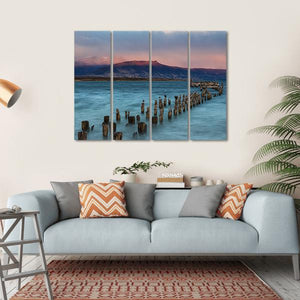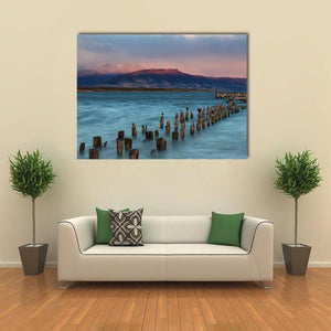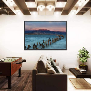 Capture the serene beauty of a tranquil ocean scene with the Old Landing Stage Chile canvas wall art. Featuring a realistic depiction of a pier surrounded by snow-capped mountains, this artwork offers a moody atmosphere, enhanced by a calming palette of blues and greys.