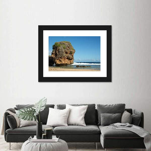 This landscape art captures a serene scene of a beach with gentle ocean waves lapping at a striking rock formation. The blend of earthy brown and green tones with the tranquil blue palette creates a natural and peaceful atmosphere, perfect for enhancing your wall decor.