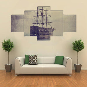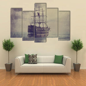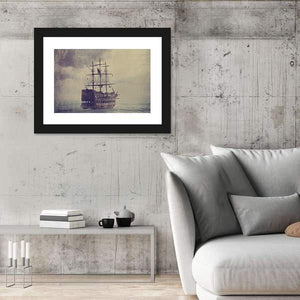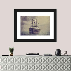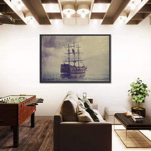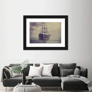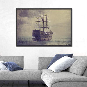 An old sailing ship battles a stormy sea beneath a brooding, clouded sky. Tattered sails and a distressed, vintage texture give the scene a dramatic, mysterious, weathered feel that works well in house and nautical room decor.