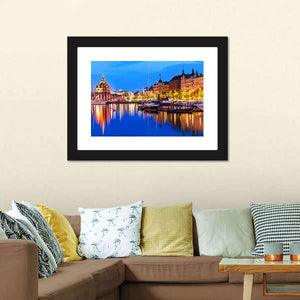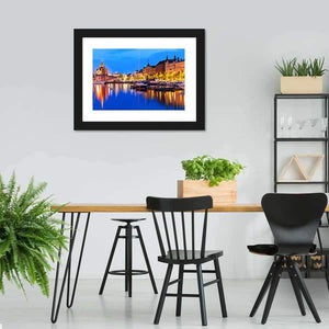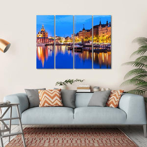 This vibrant canvas art captures the serene beauty of waterfront buildings and boats against Helsinki's night sky. The rich palette of blue, golden, and orange hues reflects in the water, creating a lively atmosphere perfect for enhancing your space.