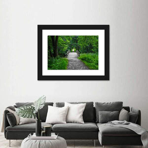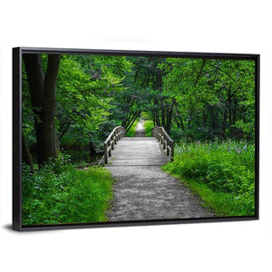 This canvas art features a serene scene of a wooden bridge nestled within a lush forest, complemented by a gravel path and trees framing the view. The gentle greens, browns, and grays create a peaceful, inviting atmosphere, making it a perfect addition to any nature-inspired decor.