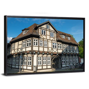 A half-timbered house in Braunschweig, shown from a corner perspective with many windows, diagonal beams and dark roof tiles against a blue sky. The brown, white, blue and red palette and traditional, historic mood suit historic or traditional-style rooms.