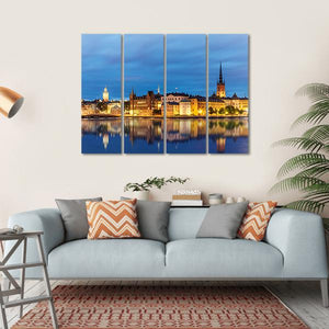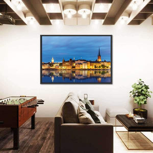 Experience the serene beauty of Stockholm's Gamla Stan with this captivating canvas wall art. Featuring a city skyline reflected in calm waters, the vibrant blues and golden glows of the architecture convey an elegant, tranquil atmosphere.