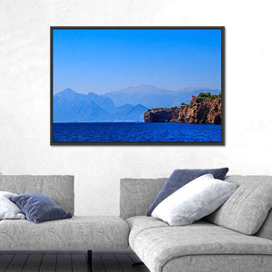 Old Town Kaleici Canvas Wall Art shows a serene coastal landscape of ocean, rocky cliffs with sparse trees, and distant hazy mountains under a clear blue sky. The composition emphasizes depth and the rule of thirds, with a palette of blues, browns, greens, and tans. It suits coastal, modern, or nature-inspired rooms.