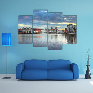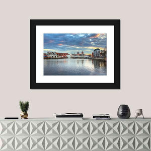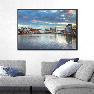 Old Town Of Gdansk Canvas Wall Art depicts waterfront buildings and a bridge over a calm river beneath a cloudy sunset sky, capturing a calm, picturesque evening. Rendered in a realistic style with blues, grays, browns and touches of orange and white, it creates a serene focal point. Fits well in modern living rooms, studies, or hallways that favor cityscape décor.