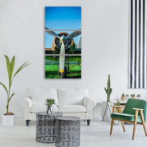 A close-up, low-angle view of a three-bladed airplane propeller and engine cowling that puts the subject front and center. Rendered in green, brown and blue with silver and yellow accents, the image feels nostalgic and powerful with a vintage tone. It fits retro or aviation-themed rooms and wall decor.
