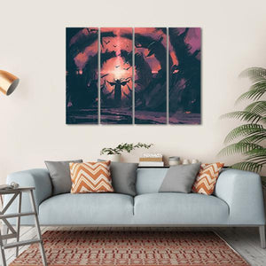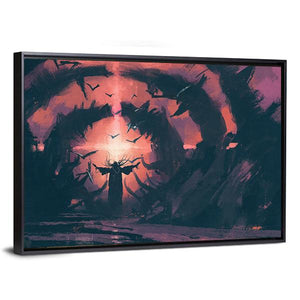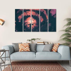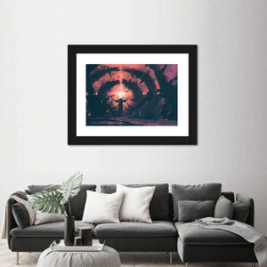 This captivating piece portrays a mysterious figure in a dark tunnel, surrounded by a flock of birds in flight. The rich palette of purple, pink, and black creates an ominous atmosphere, making it a striking addition to your wall decor.