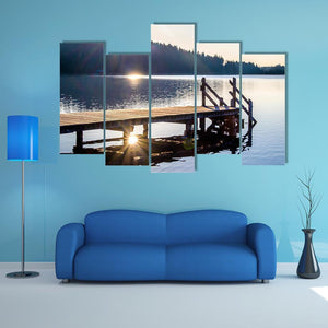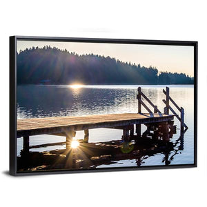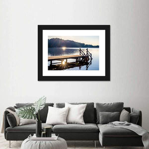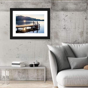 Old Wooden Jetty shows a quiet lakeside scene with a weathered dock, trees, and morning sunlight shining through the planks. The naturalistic palette of blues, browns, greens, and soft yellow light gives the piece a serene, peaceful mood. It suits home wall decor such as living rooms or bedrooms.