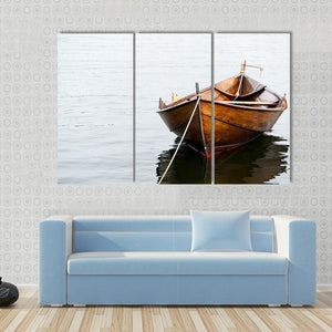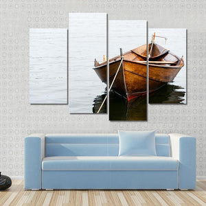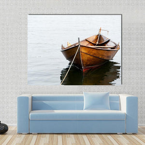 This canvas art features a serene wooden boat resting on calm waters, capturing a peaceful moment in nature. The earthy palette of browns and grays creates a warm atmosphere, making it a lovely addition to any space.