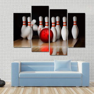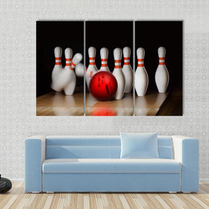 This dynamic canvas art features a close-up of striking bowling pins and a glossy bowling ball. The dramatic use of red, white, black, and brown evokes an active and thrilling atmosphere, perfect for a sports-themed space.