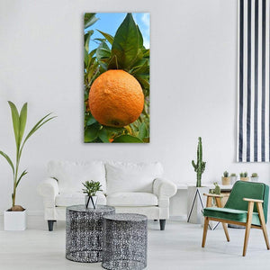 A close-up, photorealistic image of orange fruit and detailed green leaves in a warm orange, green and blue palette. The print reads vibrant, fresh and natural, with textured orange peel and crisp leaf detail. Works well in a kitchen or modern room decor.