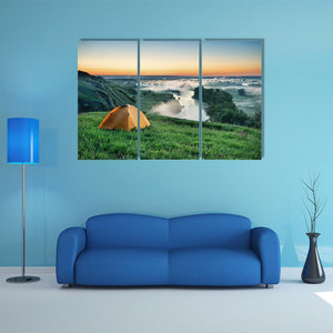 A single orange tent sits on a grassy hillside at sunrise, with a river winding through a misty valley. Rendered realistically in orange, green, blue, white, and yellow tones, the scene feels calm and peaceful and works well in modern or nature-themed rooms.