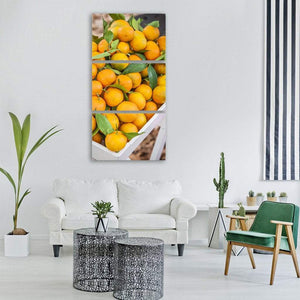 This close-up canvas features piled oranges, some with leaves attached, resting in a white crate for a fresh, natural feel. Realistic, vibrant colors — orange, green, white and brown — give the piece a lively food-themed look that works well as kitchen or dining-room wall decor.