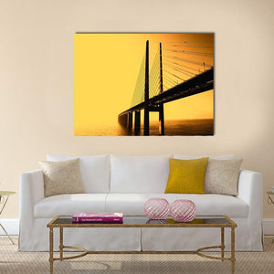 This striking canvas art features the Oresund Bridge, beautifully capturing its silhouette against a warm sunset. With shades of yellow and orange blending into the calm water, it evokes a serene and majestic atmosphere ideal for any modern decor.
