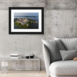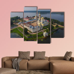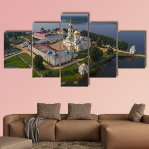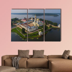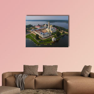 Aerial View Of Nilo-Stolobensky Canvas Art presents the monastery complex and its island lake from above, showing golden domes, white buildings, trees and calm water. Rendered in a realistic palette of blue, green, white, yellow and grey, the scene feels serene, historic and picturesque. Suits home wall decor and quiet spaces such as a study or living room.