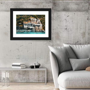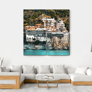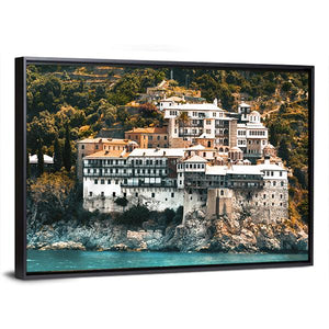This canvas art features the Osiou Gregoriou Monastery against a backdrop of coastal cliffs and the ocean. The scene captures a serene and majestic atmosphere, showcasing white buildings atop rocky cliffs amid lush green trees and vibrant blue water.