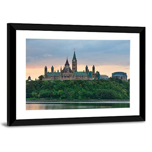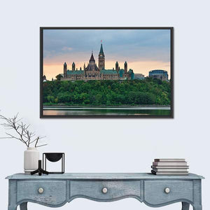 This canvas art beautifully captures the Ottawa skyline, showcasing Parliament Hill and the Ottawa River. With a serene and picturesque mood, the artwork features detailed architecture and lush greenery under a cloudy sky with hints of sunset.