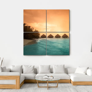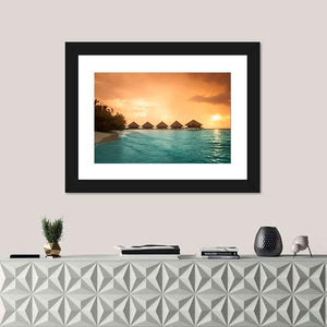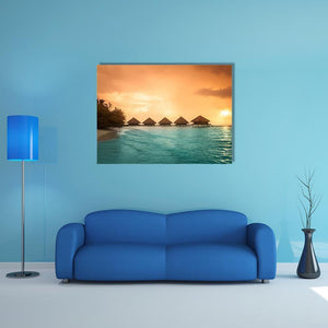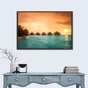 This canvas art features peaceful overwater bungalows set against a tropical beach and an ocean sunset. Its tranquil palette of orange, teal, and blue evokes a romantic and serene atmosphere, perfect for adding a calming touch to your space.