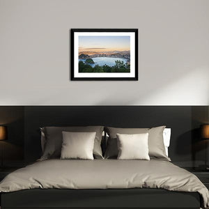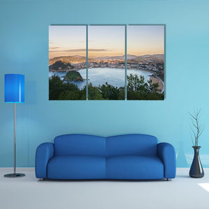 Experience the serene beauty of the Bay of San Sebastian with this landscape canvas wall art. Featuring a wide shot of the coastline, an island in the foreground, and city lights set against a tranquil palette of blue, green, and orange, it adds a peaceful touch to any space.