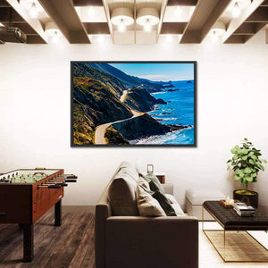 This canvas art captures a scenic coastal road winding along cliffs in California. With shades of blue, green, and brown, it evokes a serene and adventurous atmosphere, perfect for any landscape lover.