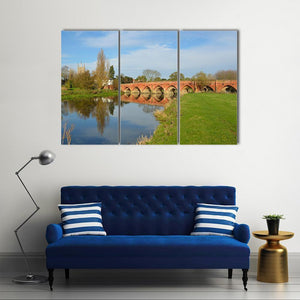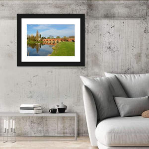 This canvas wall art features a serene landscape of the Packhorse Bridge over a tranquil river, with beautiful reflections of trees and a church steeple. The peaceful blue and green palette enhances the natural beauty of this scene.