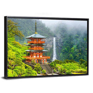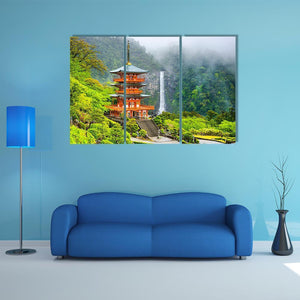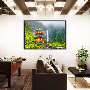 This realistic canvas depicts the five-tiered pagoda of Seigantoji beside a misty waterfall, set among dense green trees. Muted orange, blue, and gray tones create a serene, lush mood that suits living rooms and Japanese-inspired spaces.