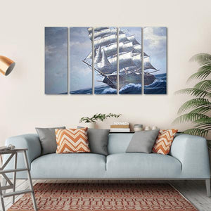 This artwork captures the dynamic beauty of a tall ship navigating a stormy ocean, with furled sails and a bold dark hull. The dramatic palette of blues, whites, and grays evokes a powerful sense of adventure, making it a striking piece for any nautical-themed décor.