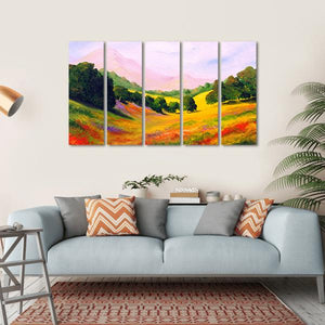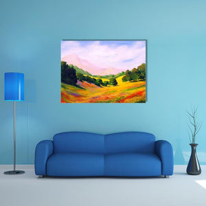 This vibrant painting captures a serene landscape of rolling hills, a colorful flower field, and distant mountains under a bright sky. The cheerful palette of yellow, green, red, blue, and purple, combined with painterly brushstrokes, brings life and depth to any wall.