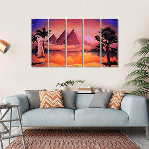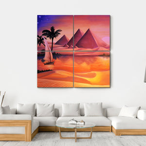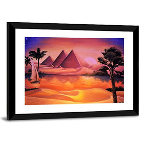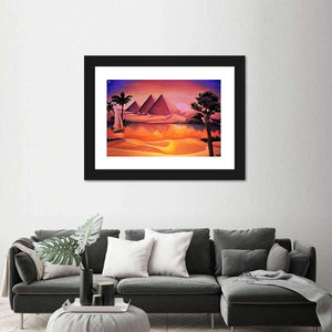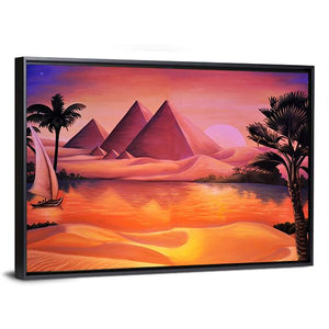 This canvas art captures the dreamy beauty of the pyramids and the tranquil Nile River. Set against a stunning sunset sky, it evokes a serene atmosphere with reflections on the water and palm trees in the foreground, perfect for adding a majestic touch to your home decor.
