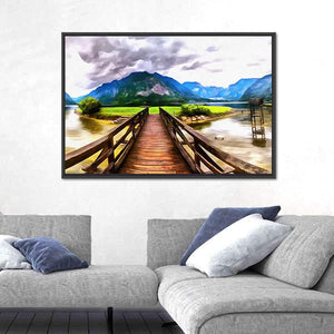 This serene landscape features a wooden bridge set against majestic mountains and a tranquil lake, all under stormy clouds. The inviting color palette of greens, browns, and blues creates a peaceful atmosphere for any space.