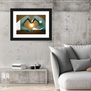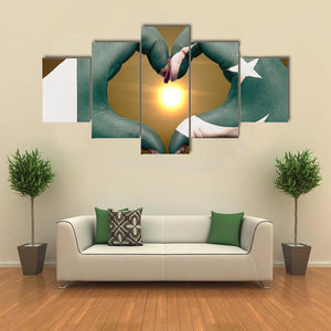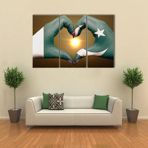 Hands form a heart around a Pakistani flag pattern set against a warm sunset in green, white and gold, giving the image a graphic, symbolic feel. Composed using the rule of thirds, this canvas wall art carries a patriotic, loving mood and suits modern home decor.