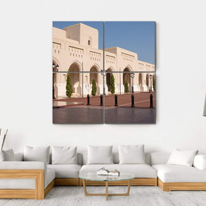 This canvas art captures the grandeur of Sultan Qaboosh's palace in Muscat, showcasing architectural beauty and a serene atmosphere. The peaceful scene features elegant arched windows, ornate lampposts, and a clear blue sky, making it a beautiful addition to your wall decor.