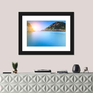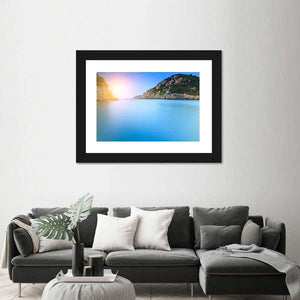 A photorealistic view of the ocean coastline with the sun setting over calm waters, captured in wide-angle, rule-of-thirds composition. Soft blues, warm oranges and earthy greens and browns give the scene a serene, peaceful mood that suits modern living rooms or coastal-themed spaces.