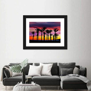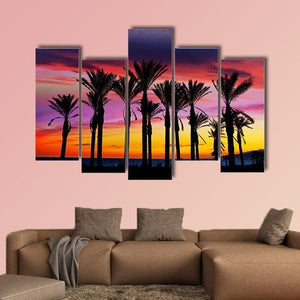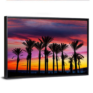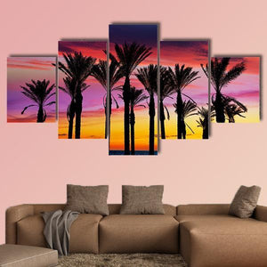Palm Trees in Retamar Beach, Spain shows silhouetted palm trees against a dramatic sunset over the ocean. A vibrant palette of purple, orange, pink and yellow gives the scene a serene, colorful tropical mood. Rule-of-thirds composition and dramatic sunset clouds create a balanced, scenic look that suits modern home decor and room settings.