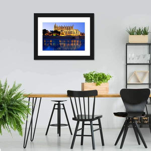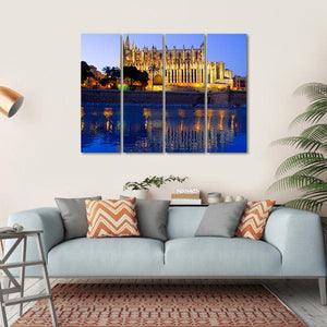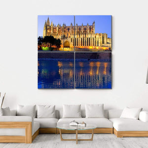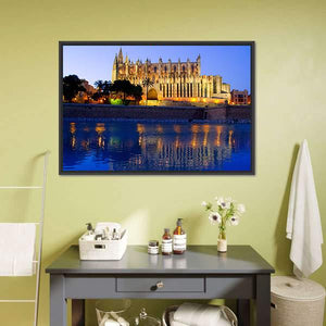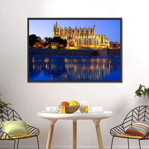 Capture the grandeur of Palma Cathedral with this striking canvas wall art. The photorealistic depiction features the stunning gothic architecture reflected in calm waters, surrounded by palm trees under a serene sky in shades of blue and gold. Perfect for adding a touch of elegance to your space.
