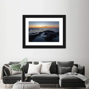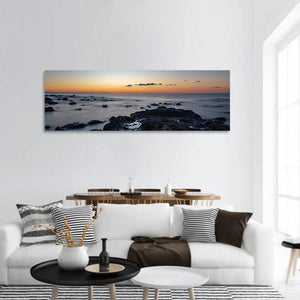 This panoramic canvas shows a calm seaside sunset with orange and blue tones, dark rocks in the foreground, and a long-exposure water effect that smooths the ocean. The modern, minimalist composition gives the piece a peaceful, serene mood. It pairs well with contemporary living spaces or bedrooms seeking a quiet coastal touch.