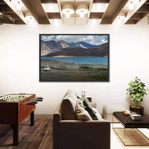 Pangong Lake, India appears in a wide panoramic print that captures the lake, gravel shore, a small white car on the road, and snow-capped mountains in the distance. The photorealistic image uses blues, browns, grays, whites, and greens to create a serene, vast, adventurous mood. It suits modern or nature-inspired rooms such as living areas and offices.