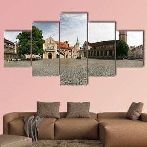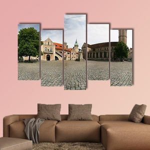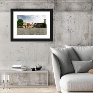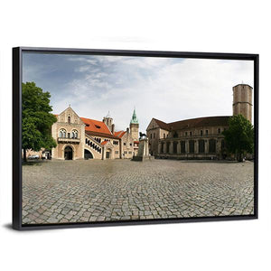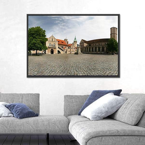Dankwarderode Castle Canvas Wall Art presents a wide-angle panorama of a historic castle, its cobblestone plaza, church tower and red-tiled roofs beneath a clear daytime sky. Rendered in a realistic, photographic style with gray, brown and blue tones, the image feels historic, serene and vast. It makes a calm architectural focal point for modern or traditional wall decor.