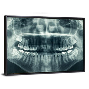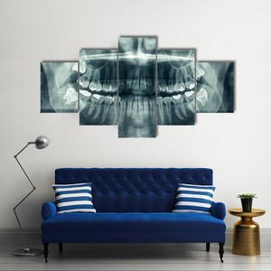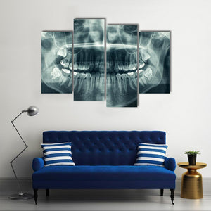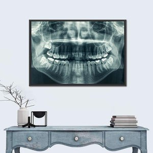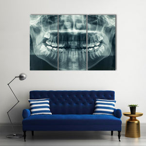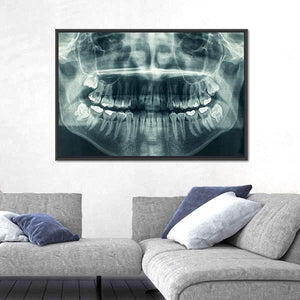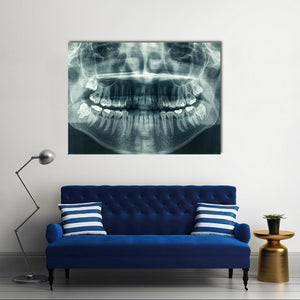 This dental x-ray canvas shows a symmetrical panoramic view of upper and lower teeth with visible roots in a blue, white, and gray palette. The clinical, detailed, and stark image suits modern or medical-inspired room decor.