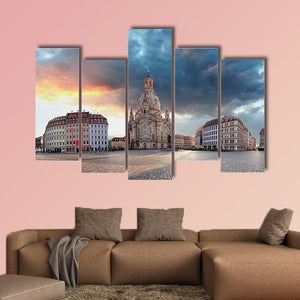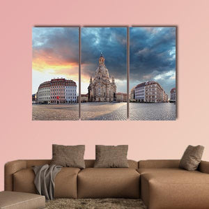 This canvas depicts Dresden’s cathedral and town square at sunrise in a realistic, panoramic view. Cool blues and greys with touches of orange and brown set a dramatic, awe-inspiring mood against a stormy sky and cobblestone plaza. It pairs well with modern interiors seeking a strong architectural focal piece.